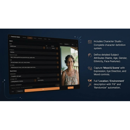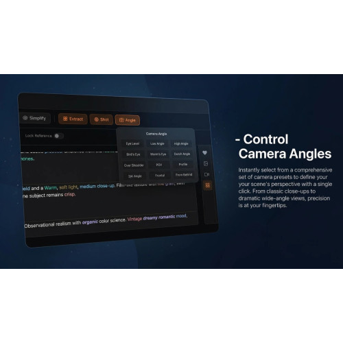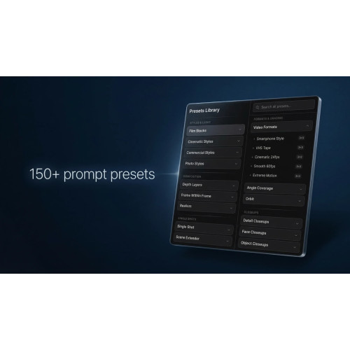Prompt faster with 150+ production-ready presets (cameras, lenses, lighting, film looks)