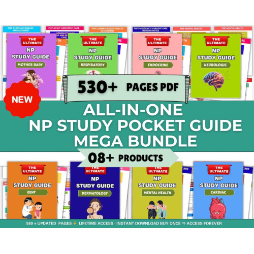 This includes ALL of the individual study guides for sale bundled into one folder (such as First Line Treatments, Signs and Screenings, Gold Standard Diagnostics, Immunizations, USPSTF Guidelines, etc) and notes on EVERY body system (including pediatrics, pregnancy and mental health) that I took from reputable review courses like APEA and Maria T. Codina Leik. There are also practice questions modeled after the AANP/ANCC certification exams w/ rationales. New content is periodically added to this bundle, so check back regularly to ensure you see all of it.