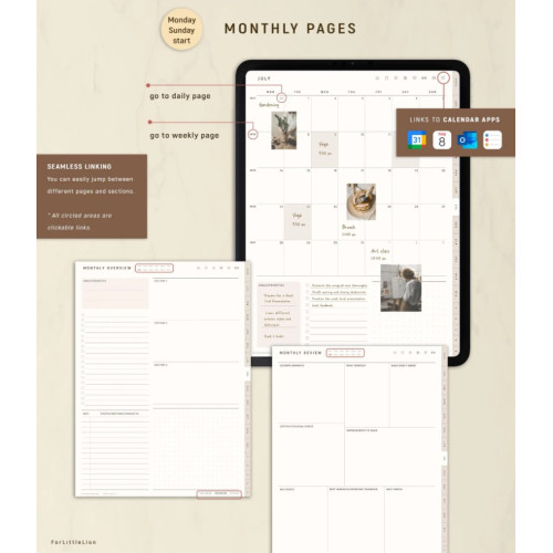 To add an event at a specific time & date to Google Calendar or Apple Calendar, click on a time slot on the daily page. Alternatively, an additional Shortcuts link allows you to add an event to Google, Apple, Outlook Calendar, & Reminders from anywhere in the planner.