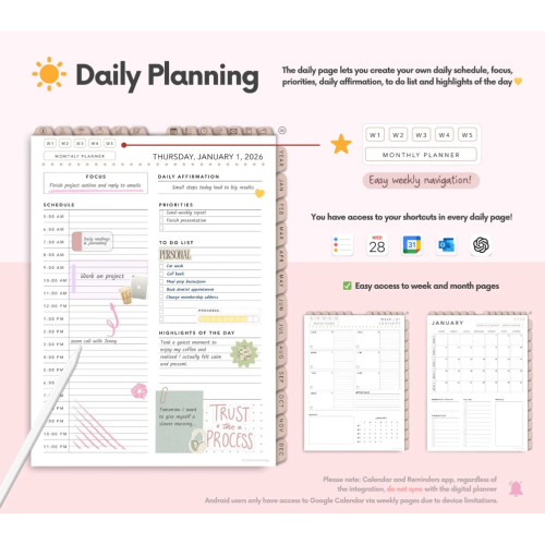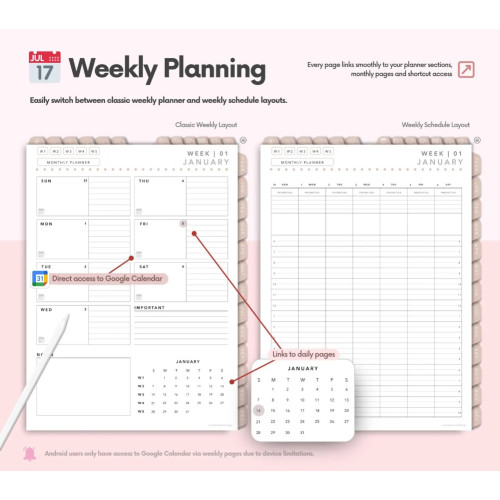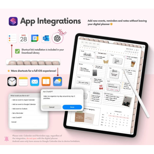 This planner includes optional features designed specifically for iOS (such as Apple Calendar and Reminders). These features are not available on Android devices. However, the planner file itself can still be used on Android with compatible note-taking apps.