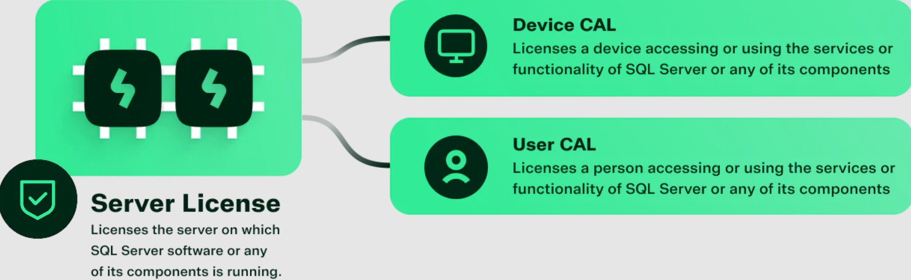 - Each user and/or device accessing a licensed SQL Server requires a SQL Server CAL that is the same version or newer - for example, to access a SQL Server 2017 Standard Edition server, a user would need a SQL Server 2017, 2019, 2022 or 2025 CAL.