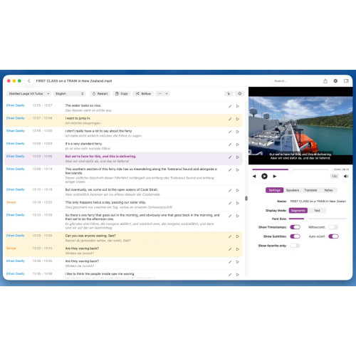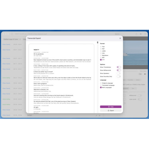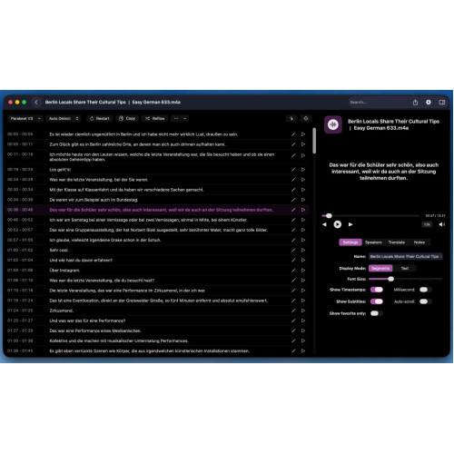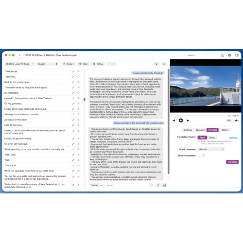 • Translate transcripts into 100+ languages with Apple Translate or DeepL